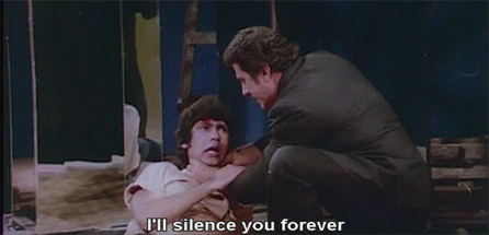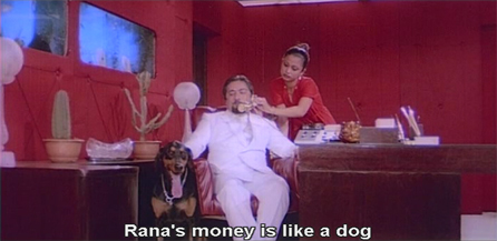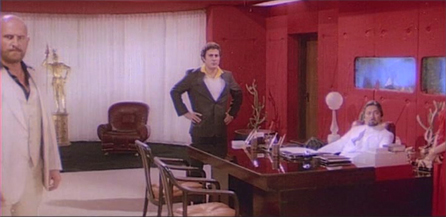 I love a) the fish tanks behind him; b) the wall-color-coordinated pretty assistant whose job it is to hold the phone to his ear; c) the panting doberman with the Kali-like tongue; d) it’s Saeed Jaffrey! and e) his goondas are Bob Christo and Yusuf Khan, the best henchmen ever! Fabulous.
