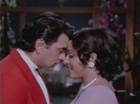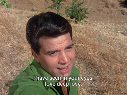 6. “Dekha Hai Teri Aankhon Mein” from Pyar Hi Pyar (1969) (sung by Rafi, music by Shankar Jaikishan). Just a gorgeous gorgeous tune, and Dharmendra is so so beautiful as he woos a reluctant Vyjayantimala—who thinks he is someone else. Excellent film, too!
