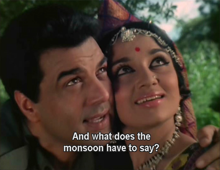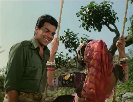 7. “Kuch Kehta Hai Yeh Sawan” from Mera Gaon Mera Desh (1971) (sung by Rafi and Lata, music by Laxmikant Pyarelal). Dharmendra and Asha Parekh—one of my favorite heroines—and a beautiful picturization of a pretty song. The beginning notes sound like rain falling from the monsoon that they are singing about. Plus, a swing! and it’s a great film.