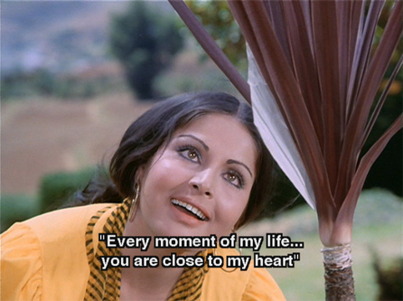 1. “Pal Pal Dil Ke Paas” from Blackmail (1973) (sung by Kishore, music by Kalyanji Anandji). Picturized on Rakhee reading love letters that he’s written to her but been too timid to send, this is possibly the most romantic song EVER of all time (although some of Shammi’s come awfully close). If movies were real life, I would want to be Rakhee in this film.