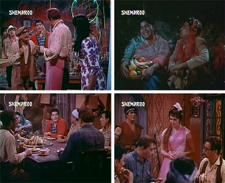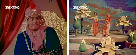 The sets just keep getting better and better: giant mushrooms and mammoth tusks! Rita falls and hits her head…and dreams that she and Shobha are competing for Ajit’s attention with a dance. I love the smug look on his face! It’s a lovely duet, and one of my all-time favorite Helen numbers (“Tumko Piya Dil Diya”).