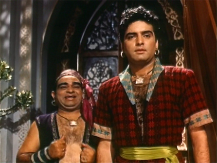 Feroz looks like he is about 18 years old, and he is faced with seemingly insurmountable obstacles: a two-headed monster, a lecherous sorcerer, greedy brothers and a lazy genie (with full support from the Genie’s Union), among others. He is aided by the love of two beautiful princesses, a diminutive sidekick and his clever canine in a rollicking, humorous Arabian Nights tale with really lovely songs by GS Kohli throughout.