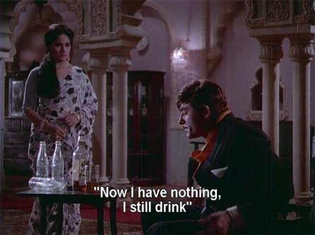 This film’s stern message is pretty much summed up in my “Effects of Alcohol” poster, although the poster is more efficient in delivering it. But the poster does not have Raaj Kumar and his gravelly voice, Padmini emoting as a put-upon wife and mother, a Comic Side Plot (Laxmi Chhaya being romanced by Rajendranath), lovely songs by Chitragupta with lyrics by Sahir Ludhianvi, Memsaab’s favorite victim Biswajeet, or—most importantly—a Helen dance.