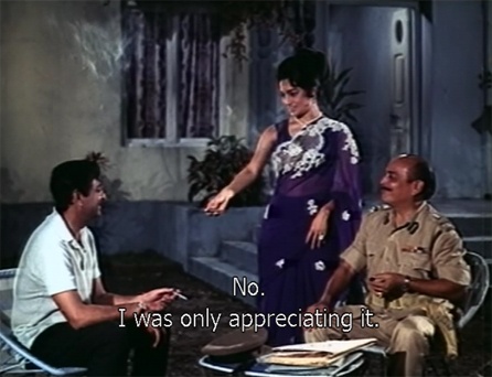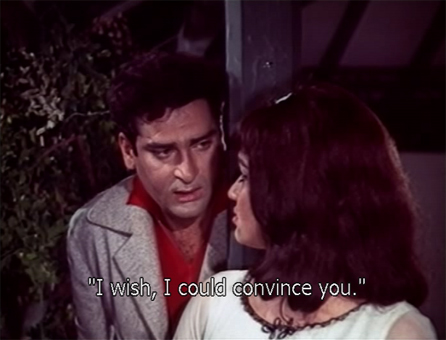 I can’t believe nobody here mentioned the first shot of Asha Parekh in the film, at the beginning of the song “Nazar mein rungg.” The director Bhappie Sonie shoots Asha’s famous posterior as she’s walking, then she lays down and we see her face for the first time. You got to admire any film that does that, and that has the famous Shammi Kapoor-Asha Parekh pairing, since I am a huge fan of them both.