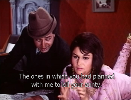 And happily, the first half of this film is quintessential early sixties Shammi-style frothy fun, as he bombards a reluctant and feisty Asha with his mischievous charm and romantic songs. But then everything turns suddenly dark, with death and blackmail looming large, and levels of gloom, self-pity and self-sacrifice rarely seen even by the most devoted Hindi cinema fan (me again). If you don’t mind a little movie multiple personality disorder, then you can probably tolerate it. If you prefer a logical narrative without completely over-the-top dramatics…then you probably aren’t reading this anyway.