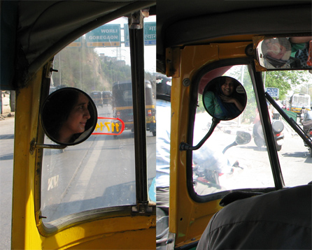 I was very happy to meet the talented Banno (and Dhanno and Teja)—they fed me a yummy lunch at their home and gave me some lovely gifts including two of Teja’s drawings. Yay! In Delhi I met Madhu, who went shopping with me (not a task for the faint of heart!) and took me to a great Italian restaurant for lunch (owned, apparently, by a guy from Sicily who came to India to escape the mafia). It was just great to meet my filmi soulmates in person finally! They also both took me on auto rickshaw rides (I love auto rickshaws) and I accidentally caught both of them in the rear-view mirrors.