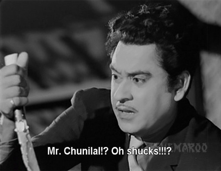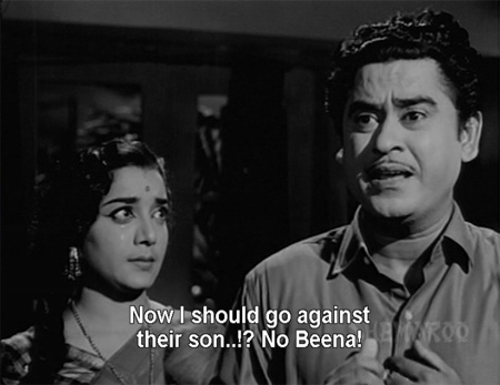 In fact, he hasn’t even told them that he knows Arun is stealing money from the factory in league with Chunilal. He’s afraid that it will be the death of Kamla, who dotes on her long-lost son (and on Kishore himself, too).
