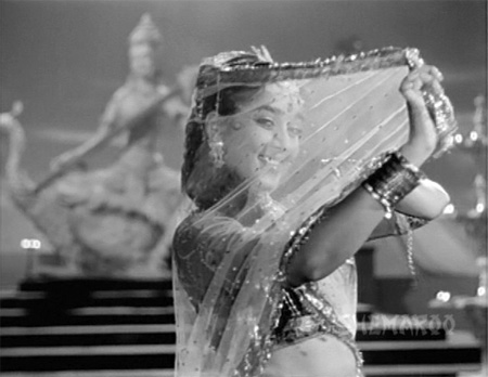 They take him home with them, and he is quickly head over heels for Beena—and she for him. To further their romance, he doesn’t tell them about the mistake in identity when he figures it out either, but goes ahead and performs at the music show with Beena. It’s a very fun song with nice dancing by Jamuna. I particularly love the set, with a giant Saraswati and oodles of traditional ghee lamps!