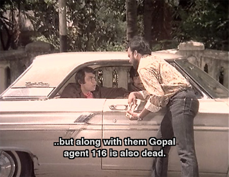 How could something that begins with this screen possibly be bad? Dharmendra as James Bond Agent 116! A great many more title screens follow, with more good news: Padma Khanna, a very young Rekha, Prem Chopra in a blond wig and pink rimless glasses—ooh! my man Ranjeet!—Jayshree T, Rajendranath, Agha, KN Singh…the list goes on. I settle happily in my chair, looking forward to some stylish and loony shenanigans. But I’m in for a little surprise.
