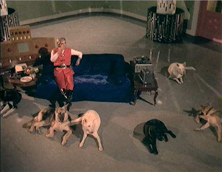 Shakti Maan (Prem Chopra) has one of the most strangely benign and hilarious lairs I’ve come across yet. He sprawls on a blue velvet sofa surrounded by dogs in the middle of a very large room with a shiny floor.