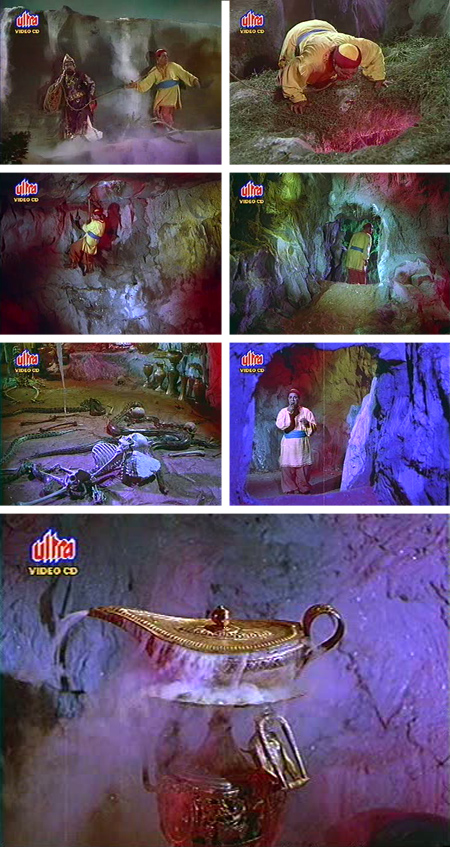 While Jameela readies herself for her wedding, the Magician King drags the unfortunate Aladin up a steep mountain to a very gaudily lit cave. He lowers Aladin into it and orders him to find a lamp hidden inside.