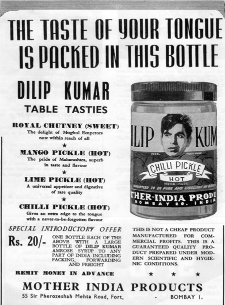 Long before Paul Newman appeared on bottles and jars of “Newman’s Own” salad dressings and spaghetti sauce, Dilip Kumar’s image was decorating jars of “Table Tasties” chili pickles. Hot indeed!