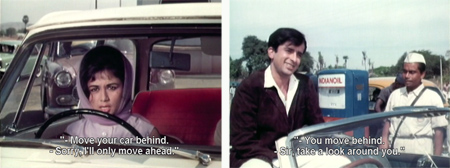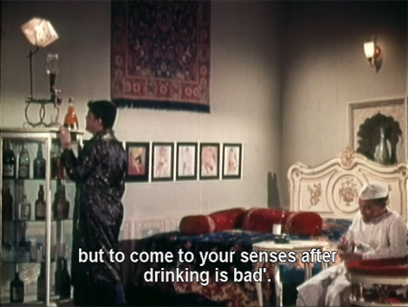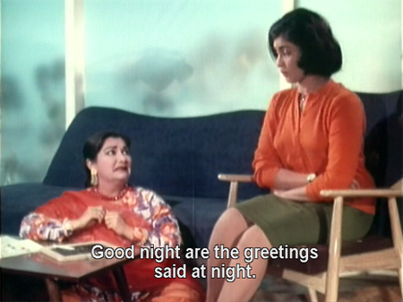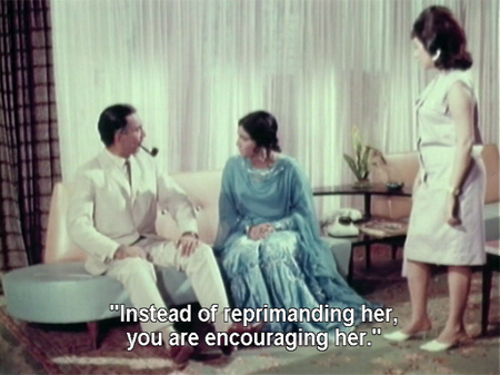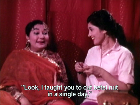 Begum Manorama is taking (and failing) English lessons from her tutor Miss Paul (Shashikala). Manorama is hilarious—it’s fun to see her doing comedy—and I am thrilled as always to see the lovely Shashikala.