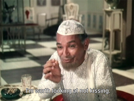 Om Prakash plays an ambitious village barber who wins a lottery and uses his new-found wealth to restyle himself as the Nawab Ajmutullah Khan and shift his family—son Anwar (Shashi Kapoor) and “Begum” (Manorama)—to a palatial mansion in Delhi. Since his ambitions have also prompted him to educate his son well, Anwar settles into their new lifestyle easily, but the poor Begum does not. To the Nawab’s chagrin, she insists on keeping company with “low-class” singers, and chews paan just as she always did—she sees no reason to pretend to be anyone other than who she is.