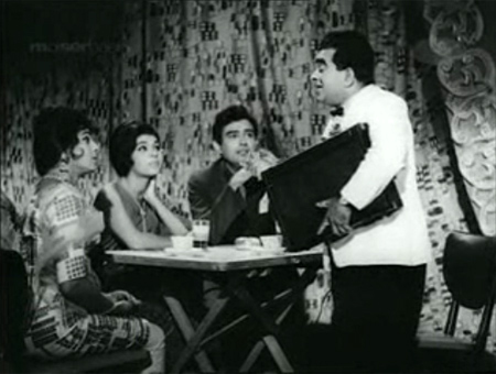 We meet con-artist Banarsilal (Mukri) who smashes bottles of fake whiskey against opening car doors and then weeps inconsolably until the car’s owner gives him 10 Rs for another bottle of “English” whiskey. In the evening, he becomes acquainted with Mohan and Bela at a nightclub where he is now posing as a wealthy businessman from London.