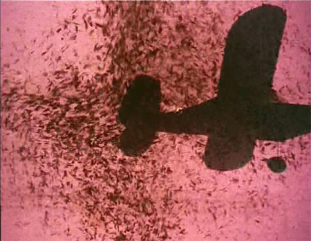 Kajal applies some too, and they fly their small plane directly into an oncoming locust swarm. They probably should have put their repellent on the plane itself, because all those locusts getting into the engine causes them to crash.