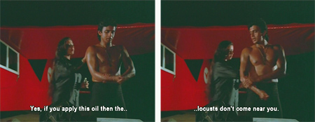 Shakti Kapoor plays a character named…Shakti Kapoor! I cannot abide the man; even before I knew what a creepy guy he is in real life too, I couldn’t stand him. But that creep factor does make him really villainous. And his deeds in this film are even creepier than he is—he is unleashing armies of locusts on local farmers to manipulate the price of wheat and rice (which he has also doctored with “medicine” that has an aphrodisiac effect on all who eat it).