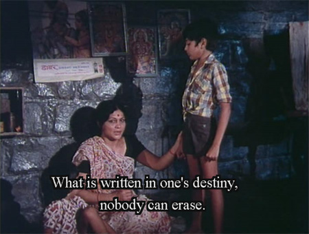 Sumitra, horrified at Vijay’s ill-treatment and bereft of a husband to lend support, decides to move with her two young sons to Bombay. There, she and Vijay decide that they will earn money so that Ravi can get an education. She gets work ferrying stones at a construction site, while Vijay begins shining shoes. Vijay is deeply sensitive and fiercely proud, traits which he has inherited from both of his parents—we get to know him well through scenes like this one: