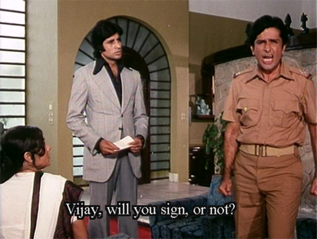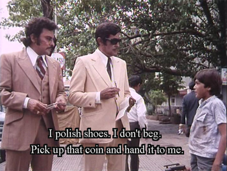 I watched a lot of films early on because they were on lists of Hindi film “classics” that one should watch. Some I remember well, some I do not. This is one that I didn’t think I remembered, until I began to watch it again and realized: “Oh this is where I saw that!” Turns out that a lot of my memories from “some movie” are all from this one. I’m hoping that the memories got fragmented because Hindi cinema was all so new to me back then—I was absorbing so many things, many of which I can take for granted now so they don’t distract me. Otherwise, I need to worry about my brain, because this is a great movie. The script and the performances are pure gold. If I had to put it simply I’d say it’s a story about choices, and the things that influence those choices and shape a human being, and it is done with such finesse that I am left speechless (okay, not really; this is a long post, even for me). It is a brilliantly crafted psychological portrait of the damaged Vijay in particular, supported by simply stunning performances from Amitabh Bachchan and Alankar Joshi, who plays Vijay as a boy. There is nothing wasted—not a word, not a look, not a nuance, not a scene.