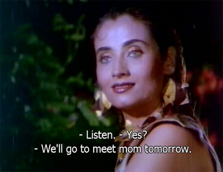 Yes, the baby was already sired when she was glaring at Amrish…I can only assume it was a bad subtitle for “give birth.” There were quite a few bad subtitles (not funny, just bad). I probably will see more Mithun films, but need some respite for a while first :)