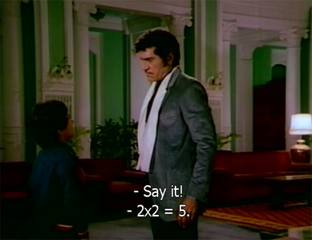 Uday Bhan Singh doesn’t recognize Avinash until he takes off his sunglasses even though he’s been warned in advance and Mithun looks exactly like himself his father. (Bob Christo reappears eventually too, and hasn’t aged a bit although everyone else has. It’s just that kind of movie.)