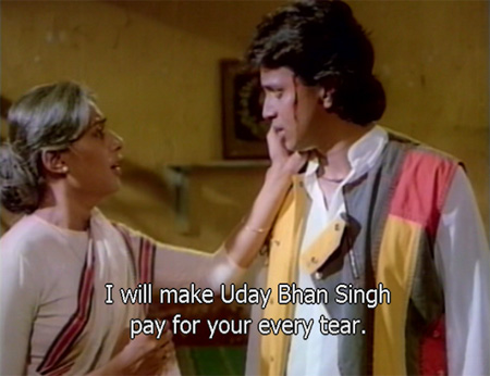 Of course in the end, despite these issues, Avinash and his Maa manage to extract gory retribution from Uday Bhan Singh and his son for the ill treatment of poor Satish (and Aarti) decades before.