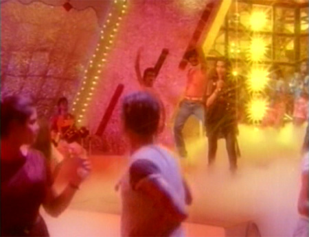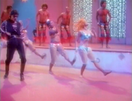 Despite Uday’s precautions, Avinash appears at Chander Bhan Singh’s (Karan Razdan—Sam Oberoi! heh) birthday party in another senses-damaging spectacle, complete with backup male dancers in fringed harlequin manpris and chubby girls in shiny metallic bikinis.
