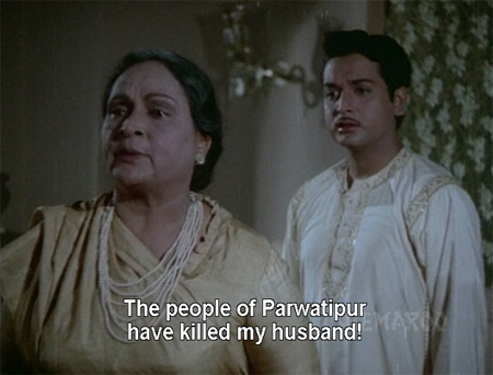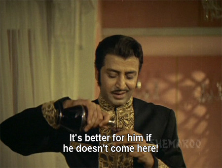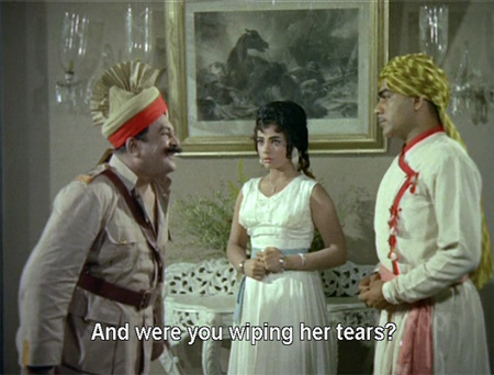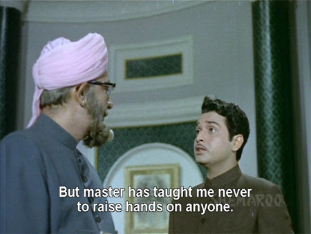 Ranimaa welcomes him gladly, and he is overcome with emotion on seeing a portrait of his mother—he has no memory of what she had looked like. Then Ranimaa calls for his manservant, Bahadur Singh: Mehmood! I groan…this was the era of Too Much Mehmood, but I am pleasantly surprised throughout the rest of the film when the CSP is kept at a bearable level, and Mehmood is integrated nicely into the main plot. He starts off by assuming that the unimpressive Manu is a servant from the village, a funny scene. When he realizes his mistake, Manu laughs and offers him his hand.