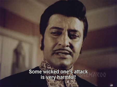 This unfortunate fact is never explained, sadly; but we’ll assume it’s one of those manly fighting issues that our king Manu has no patience (or aptitude) for. But Kunwar has discovered his cousin’s secret forays, and his love for the beautiful Bijli—and he’s about to subject them both to some wicked one’s harmful attack!