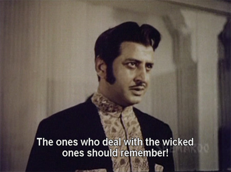 Can Manu save his Bijli and her people from evil Kunwar? Can he save himself, more to the point?! Mehmood and Mumtaz come to the fore at the end to help him, which is kind of fun; and Biswajeet is well-suited for his role as an unassuming, peace-loving king who is easily mistaken for a coward, but isn’t. It’s not a film that breaks any rules or new ground (except that I liked Biswajeet in it), but it’s good solid timepass with really wonderful songs. And Mumtaz. And Pran!