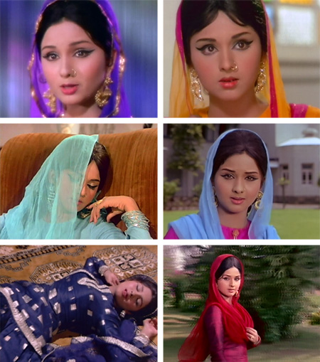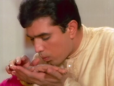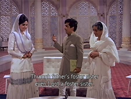 It’s widely understood that beautiful people get a pass on many things that those less favored in the looks department do not. And so it is with films too. Does it have an intelligent, spell-binding and socially relevant plot? It does not. But it is GOR-geous. Rajesh Khanna is beautiful, Leena Chandavarkar is beautiful, the costumes, the sets, the color…my god, the color! Truly only Indians and possibly the color-blind would think to combine the shades in the screen cap above (plum, scarlet and coral?) but it is spectacular. In an international beauty pageant of cinema, Muslim socials—and this one in particular—would always be a winner.