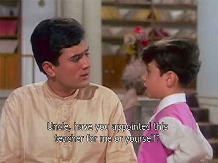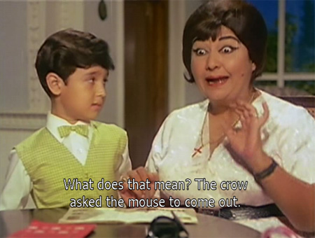 Mubola tells Yusuf about Shabana’s circumstances, and that she is looking for some tutoring work. How convenient that Yusuf’s young nephew Firangi (so named because he is “fair and naughty like the English”) (and played by a kid named Farangi) dislikes his current teacher (Manorama)!