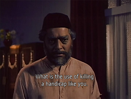 Apparently being wheelchair-bound is worse than death. Anwar decides that he would only be putting the old man out of his misery, and decides to kill his son instead, whose room he has already tiptoed through.