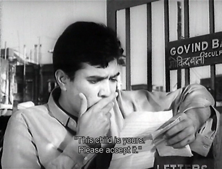 Govind now lives in Bombay, and Lajjo lurks outside his home with Buntu, watching until he drives off. She leaves a letter in his mailbox and then leaves Buntu sitting on some steps nearby and starts to walk away. She’s unable to go through with it, though, and runs back to gather him up in her arms.