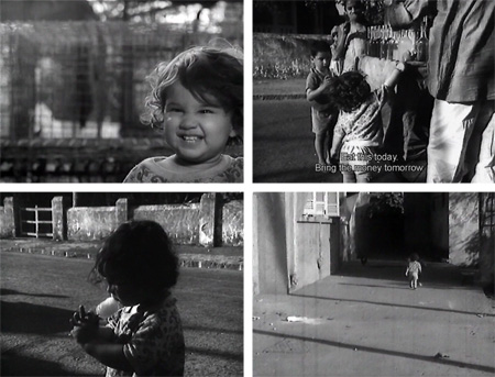 The black and white photography (Jal Mistry) is beautiful; and the camera work, following Buntu with a sort of point-of-view feel as it does, is riveting. I feel compelled to watch as the child blunders along railway tracks and across busy roads, eats whatever he can find off the ground, plays with a hapless little kitten. On Diwali, parents and children play with firecrackers as a frightened Buntu cries, until he finds a sparkler of his own.