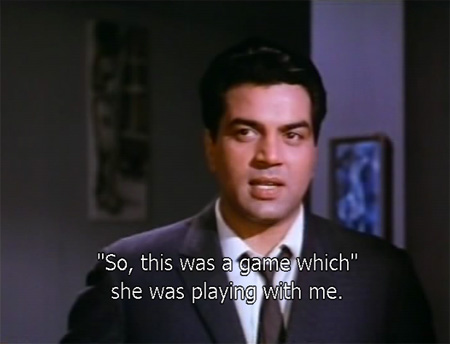 Minor Spoiler (in case you still think you can sit through this): There is one bright spot in the story. When Sunil is told that Anita’s mother is a prostitute (I know), he doesn’t care! He still loves her and wants to marry her! Yay Sunil. But it’s a different thing altogether when he discovers that Anita’s father is his own father’s murderer. We are treated to some Dharmendra Nahiiiin! Face:
