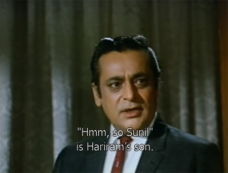 Ajit (Rehman) is the villain pulling the strings, although how or why we never come to know. All I understand is that his machinations at the beginning of the film cause a man named Vishwanath to be arrested for the murder of another man named Hariram. Vishwanath doesn’t appear to mind being incarcerated for a crime he didn’t commit (?!) and he asks Ajit to please take good care of his vast business empire and his little daughter Anita. Hariram’s demise, meanwhile, is apparently enough reason for his young son Sunil to grow up hating all rich people.