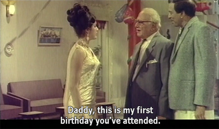 Neeta’s birthday is coinciding with Diwali (mine does too sometimes!) and she throws a big party, to which she has invited Sinha but not her father. Sinha needles Sharma about this a bit. Sharma is not healthy—he clutches at his heart and calls for a whiskey and soda, and lights up a cigarette. His doctor (Anand Saroop Kumar, the co-producer, with his brother, of the film) arrives to give him one of those magical Hindi film injections, but actually admits that it’s not likely to do much good.