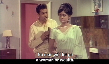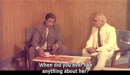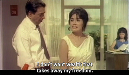 Sinha pretends to be sympathetic, and calms her by saying he will try to find a legal loophole although he has no intention of doing so. Although Sinha loves her like a daughter and wants to do right by her, he believes that she can only be happy if she’s married. Of course, in 1966 almost everyone in the world thought that way; it doesn’t upset me as a plot point, but it does make me reflect on how different my life might have been had I been born twenty years earlier!