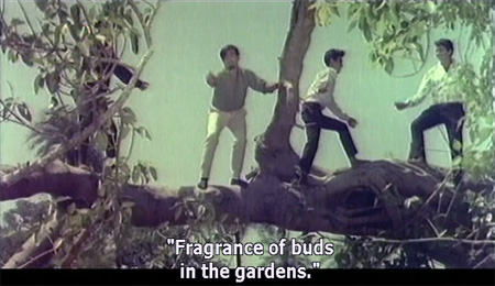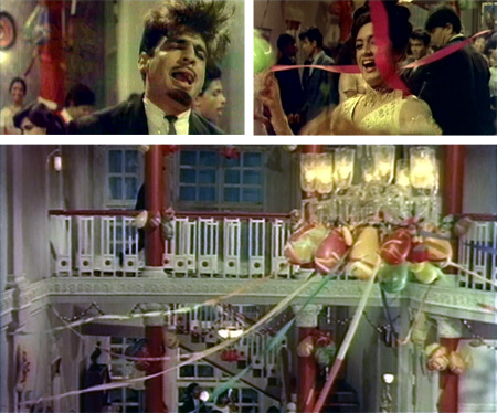 When Sinha phones Neeta to tell her that the inheritance is all hers, she celebrates with another picnic and a great song, “Mehfil Mein Dilwalon”—I love it. There is even Twisting up in the trees (and the really skinny guy to the right of center looks suspiciously like my pal Pompadour Man)!