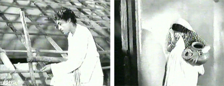 I’m not sure if Meera knows that Pratap loves Kasturi or not at this stage, although I would guess not. Meanwhile, Dukhiya and Mohan discuss the possibilities of a marraige between Kasturi and Mannu. Meera returns home with her water pot to find her handsome husband singing a sad song as he thatches the roof.