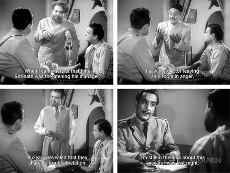 Police Inspector Sinha—who is a friend of Rajesh’s—interviews the occupants of the house and discovers that there are quite a few motives for Shrinath’s murder, and a lot of eavesdropping going on!