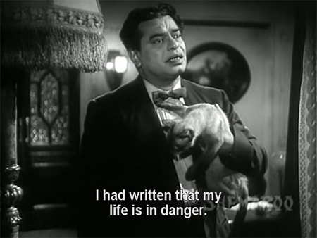 Later that night, when the police arrive to arrest Shrinath for Rai Bahadur’s murder it’s no surprise when they find him dead in his room with a knife in his back (and a very distressed yowling cat). Rajesh later spots Shobha sneaking into and out of the dead man’s room and confronts her—she has stolen the will that Shrinath had stolen from Rai Bahadur, but refuses to explain why.