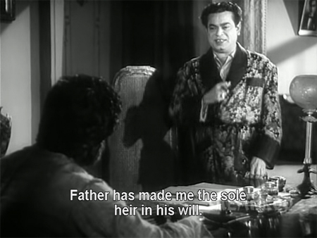 Dinanath argues that there was supposedly another will made by their father Jogeshwar Nath just before he died which left everything to Dinanath and their other brother Pitambar and disinherited Shrinath; Shrinath dismisses this claim with contempt. He does allow Dinanath to stay, however, since he is clearly ill and poverty-stricken.