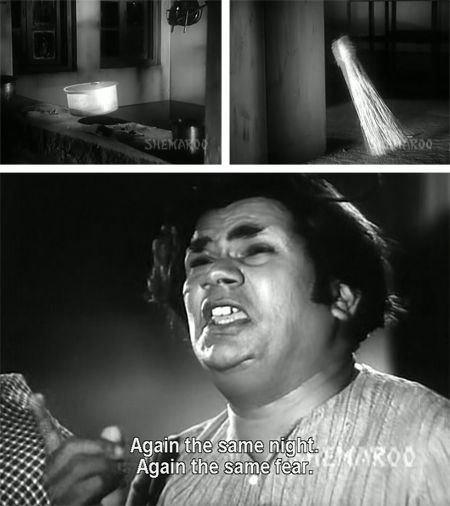And several others were really interesting to me too. In the wake of my post on Maryada and the comments that followed I expected a little more drama out of Mala Sinha, but she was pretty restrained and believable throughout. All this can probably be attributed to director Asit Sen (whose films are generally well-made) and producer Bimal Roy. For a 1950s era film there are surprisingly few songs (Salil Chowdhary) and the ones that are there are good fun, too—especially one pictured on the young Dhumal after he smokes some hash and sees plates and brooms dancing.
