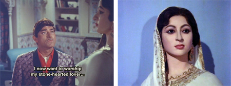 I was thrilled and delighted when Sultanat’s wedding to the Nawab does take place. The Nawab makes no demands on her (which is difficult for him since he still loves her) and is a good father to her Munna. And if the story had allowed them to eventually find their way to each other, how much I would have loved this movie. Sultanat does come to love the Nawab—but they are never allowed to be happy. This seems so unfair to me, and undoes the good that the rest of the events playing out have done. The husband who strayed is punished—check; the man who is good and honorable gets his heart’s desire—almost—check; and the woman…well, there’s the rub. She is not allowed to have a new relationship with the good man. She did nothing wrong herself, but new happiness is still denied her. She is forced to remain chaste and “faithful” to the man who betrayed her. This, needless to say, pisses me off, and it seems like total cowardice on the part of the filmmakers. It completely negates the power that the movie could have had, and should have had. Huge FAIL. Sigh.