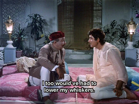The Nawab welcomes Akhtar warmly and gives him a job. Akhtar has another friend living in Lucknow, the Comic Side Plot in the form of poet Pyarelal (Johnny Walker). Another nice thing about this film is that the CSP actually helps to carry the movie’s themes along instead of going off on a completely different tangent. Plus, Johnny is funny. He always makes me laugh.