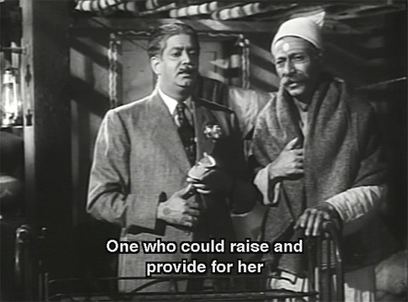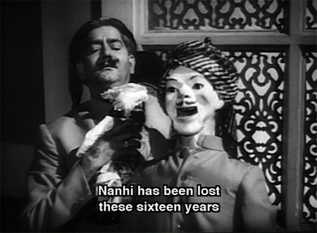 When the train pulls into the station, the Professor watches as Dev puts on his jacket and takes his leave. Having noted Rupa’s interest in him, he orders her to track the engineer down at his hotel and retrieve the necklace. He, Rupa and their musicians are invited to stay with the local zamindar Diwan Sahab, who lives with his mute servant Bhola and has a creepy ventriloquist’s dummy named Chandu. Chandu chastises him for smoking and announces the reason for the household’s obvious sadness: Diwan’s little girl has gone astray.