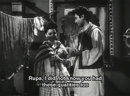 Rupa also befriends the poor sad Diwan and we discover via Chandu the dummy that because of his drinking (the Diwan’s not Chandu’s), his wife left with their daughter Nanhi and they haven’t been seen since. Rupa and Dev’s romance revs up too, especially after they are caught in a rainstorm and shelter with a poor old man (Nazir Kashmiri) (! so happy) and she cooks up a big stack of roti for them.