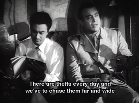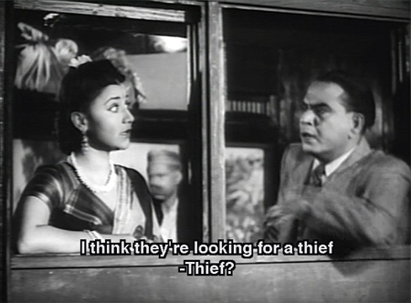 Visibly nervous, the Professor surreptitiously slips the necklace into the pocket of the young man’s coat hanging nearby. The young man (Dev Anand) is an engineer who is planning to build a utopian place for poor people to live (we call them housing projects) in the same small town that the dance troupe is visiting. The police board the train but don’t make any effort to find the necklace, although they discuss it and the inspector complains about the sad state of affairs these days.